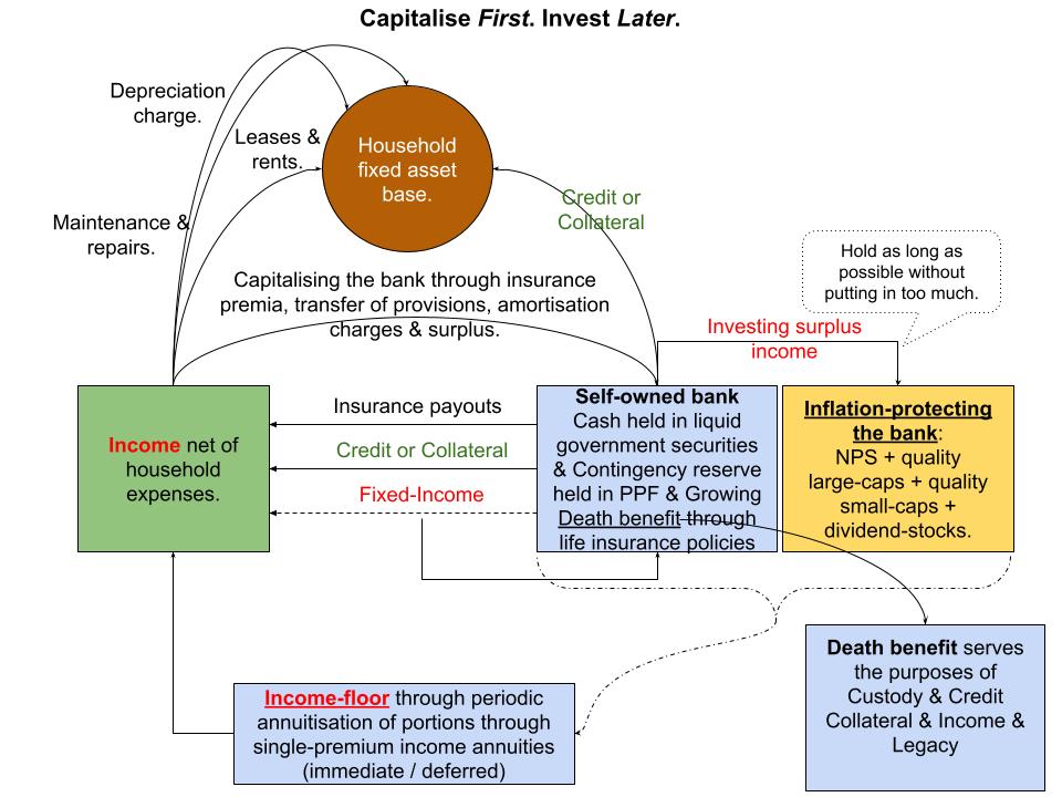 The above diagram brings it all together. It tries to model a family's internal financial flows, i.e. how cash flows between its earnings, its reserves (self-owned bank in the diagram) and its investment portfolio (labelled inflation-protecting the bank in the diagram). Importantly, it brings to the foreground a thorn in the shoe of every family: the constant diversion of earnings towards either building or fixing or maintaining a fixed-asset base.
